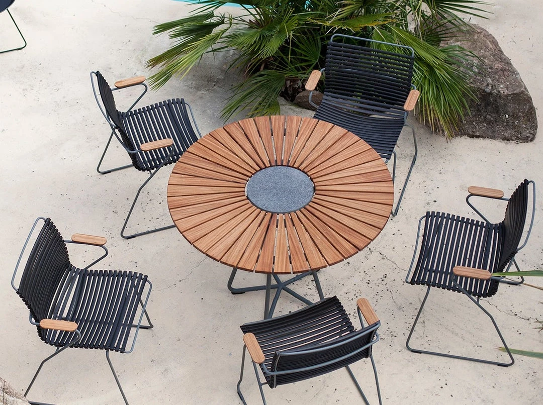 1 x Circle Dining Table 150cm: For Outdoor use, with the tabletop in bamboo lamellas and leg construction in grey powder-coated aluminium. A beautiful and well-proportioned dining table for your garden that enables free seating as the leg construction is drawn in under the table to provide comfortable legroom. Decorative granite stone in the table centre for hot pots. The bamboo tabletop is pre-oiled.