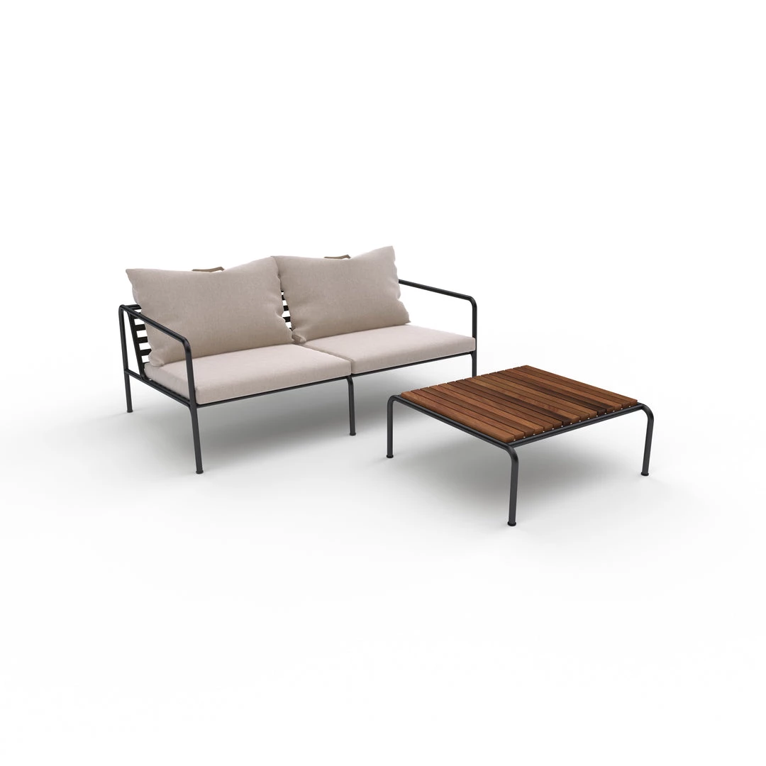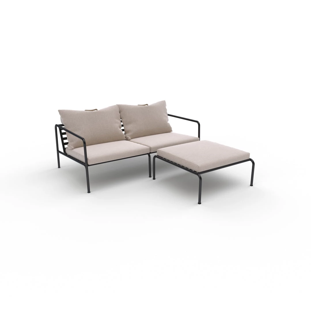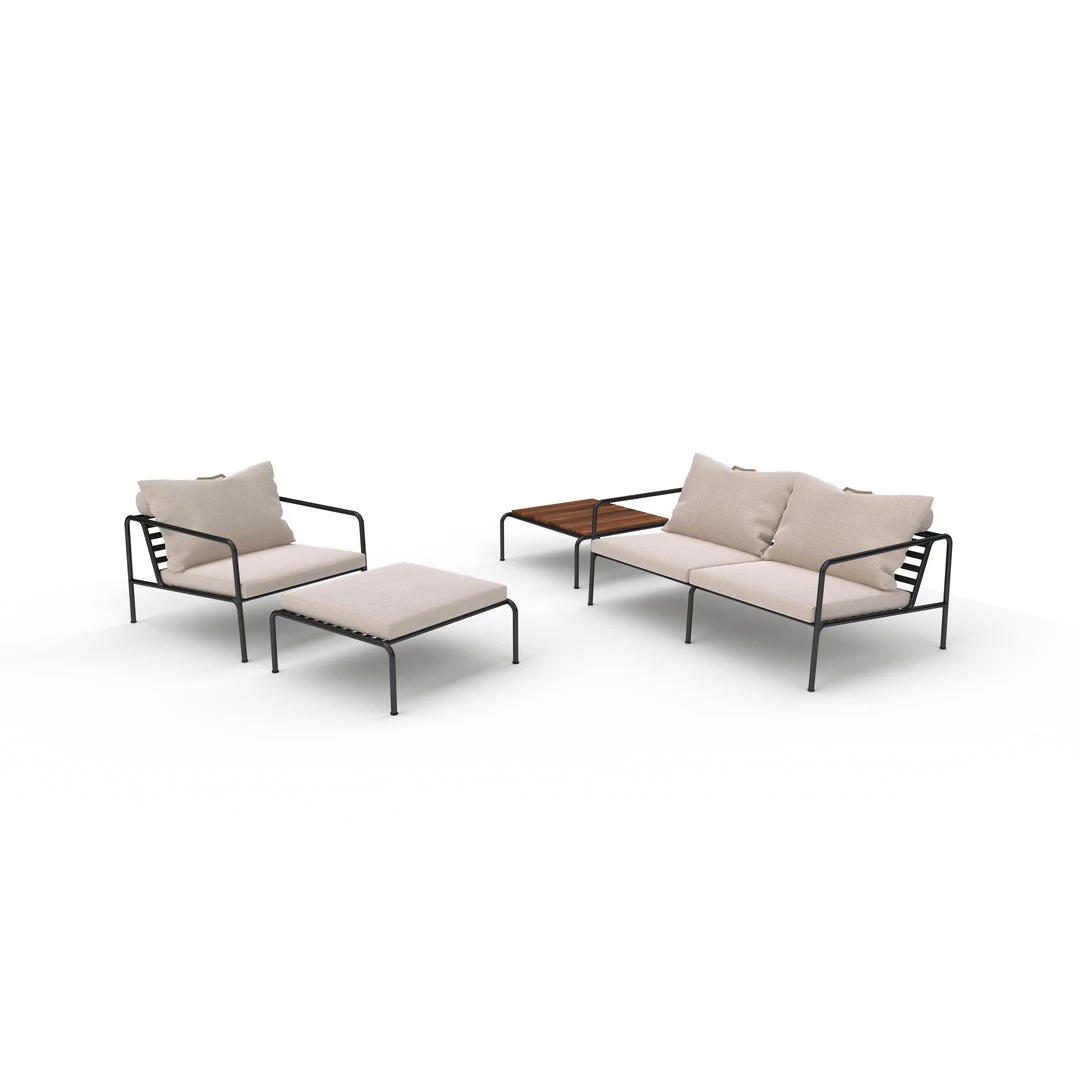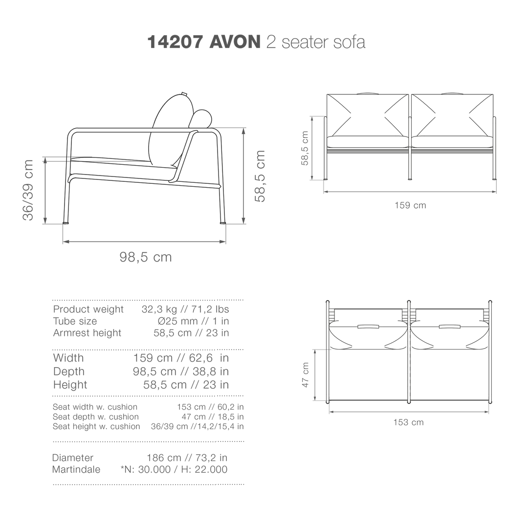 The cushions for AVON are made with Sunbrella Heritage fabric which contains 50% acrylic. Colourful fibre ends from the process of reusing the primary material may appear in the weave and vary the fabric colour from one batch to another. This creates a unique fabric with a natural look and vintage charm.