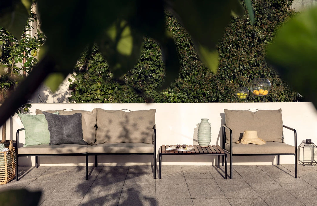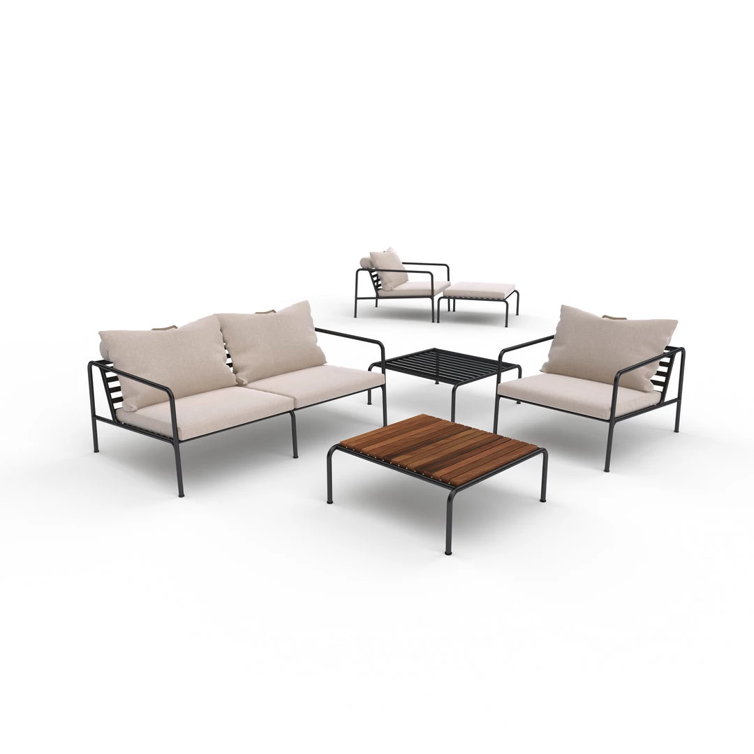 The maintenance-free frame, and the construction of the big soft back cushions, is exactly that – the simplicity of the structure, where low lines are making sure, that the design always appear proud, both with and without cushions – summer or winter. The handles of the cushions, is a statement of the function of the product, making them easy to grab and store if needed.