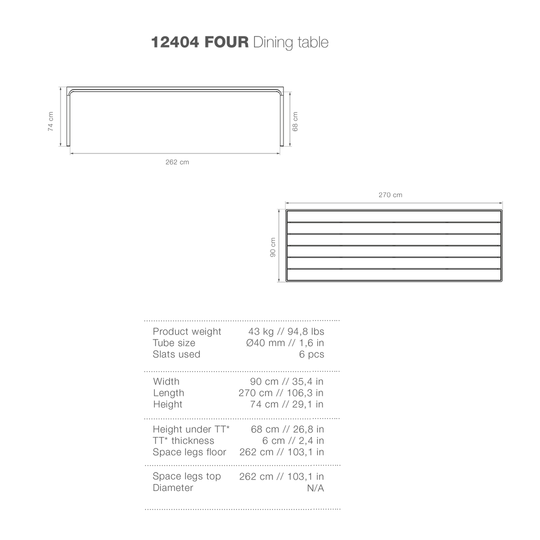 A dining table with a top and Four legs – that is what you get in Four, no matter which size you choose The frame and legs are made in powder-coated aluminium, and tabletop in bamboo or aluminium.