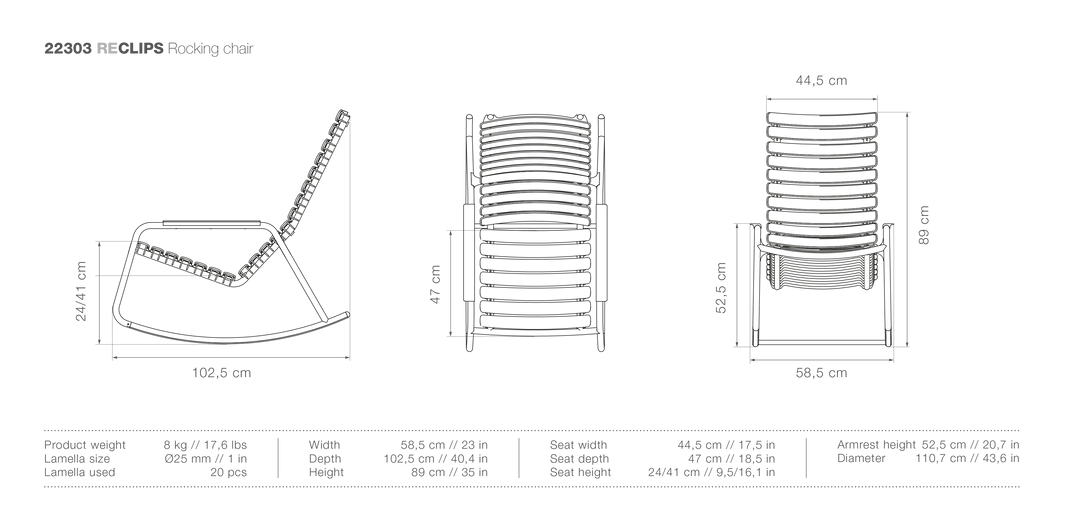ReCLIPS Rocking chairs come in 4 mono colours with the choice of armrests in bamboo or aluminium. The aluminium frame combined with the UV protected plastic lamellas, keep the maintenance to a minimum.