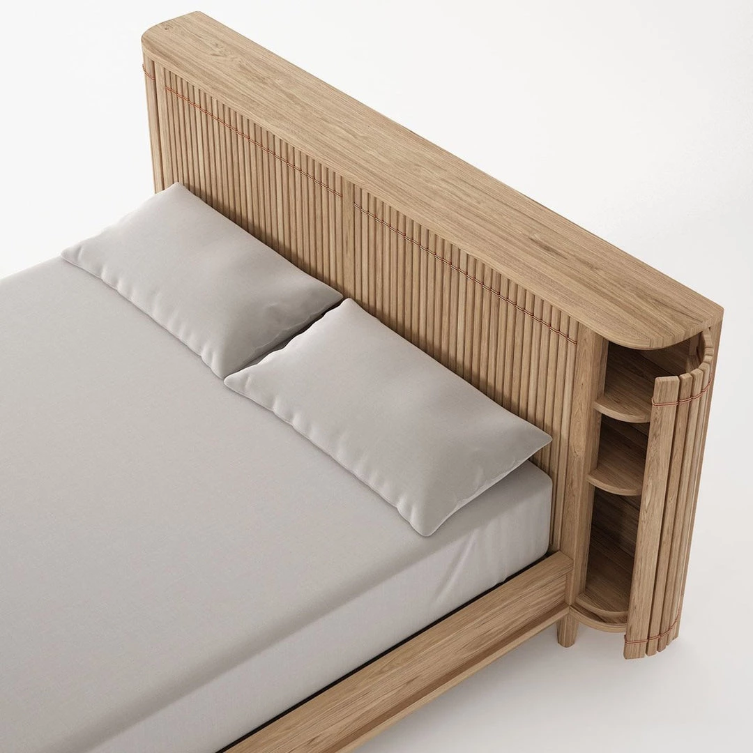 Surprising features abound within the headboard. Discreetly settled behind these wonderful slatted features is a generous supply of storage, enough to accommodate quilts, pillows, and just about anything you wish to stash. The three shelves nestled deep within the headboard offer discretion and purpose, a surprising, unexpected, and delightful resource. This beautiful piece of furniture is both practical and embracing of true artistry. The Koppar range is enhanced with the use of beautiful copper accents.