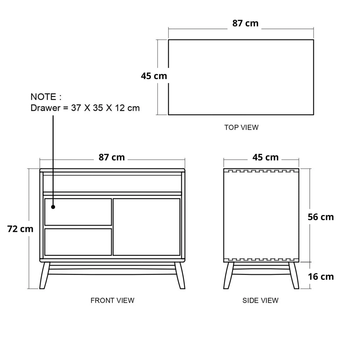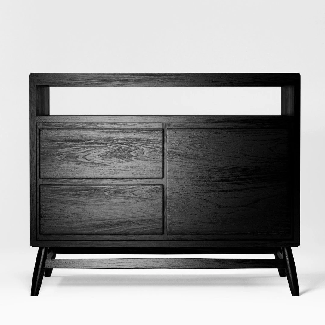 This diminutive and beautiful sideboard by Karpenter made in solid European White Oak finished with Satin Black will make a statement in the room of your choice yet offer significant and practical storage. 2 soft-closing drawers, and a cupboard with a removable shelf offer privacy for objects that don’t need to be on display yet proudly allow the display of items that you may wish to showcase if required.