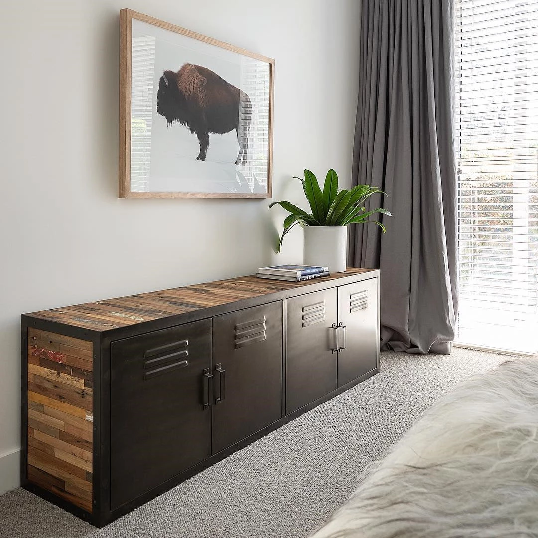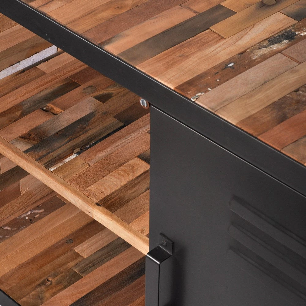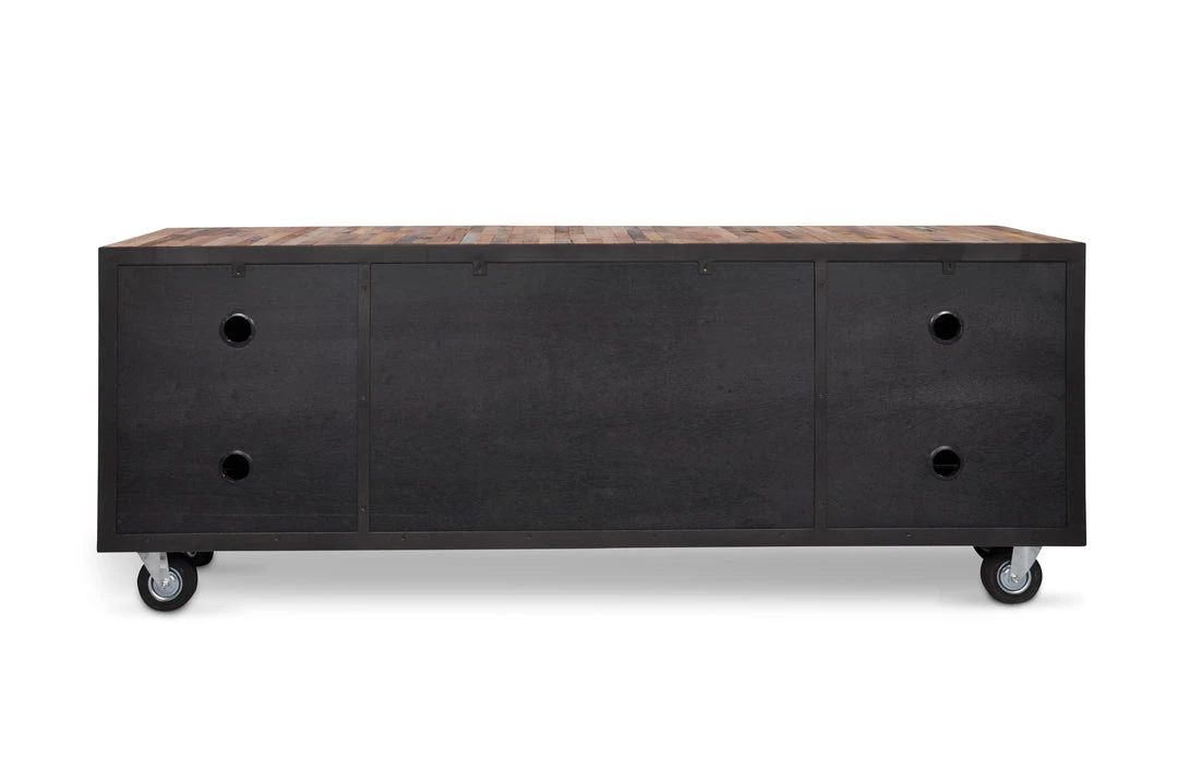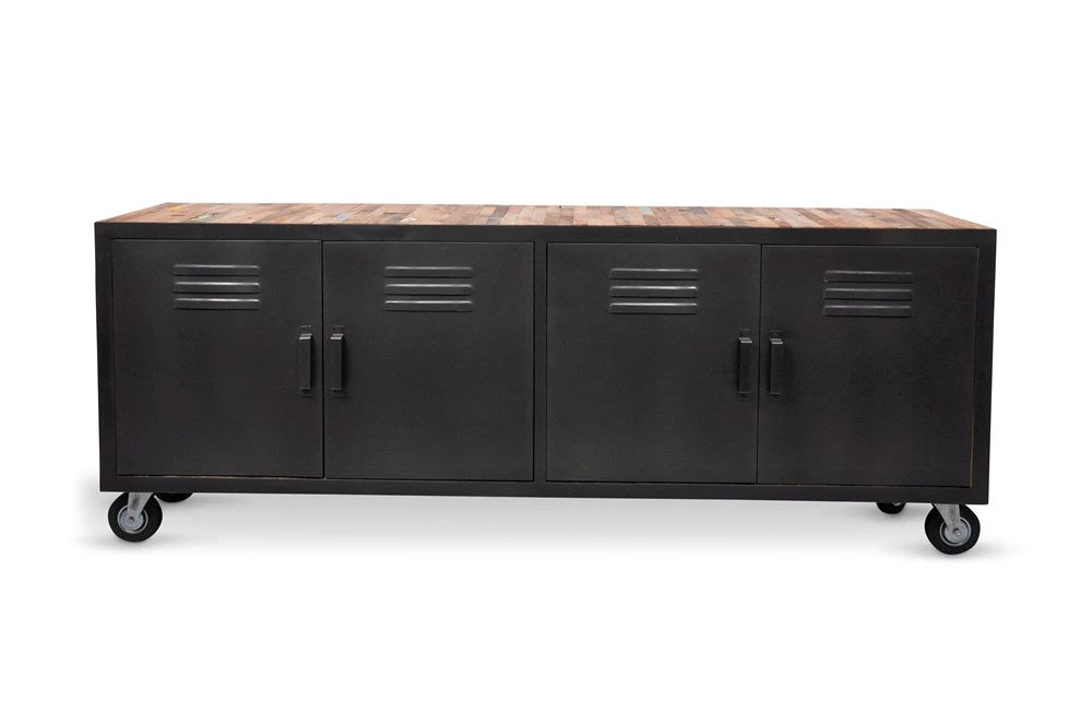 The Locker TV unit is made from reclaimed boat wood sourced from decommissioned fishing vessels and powder coated steel in a mottled metallic finish. The top is made in a parquetry style pattern from timber offcuts with 4 doors on castors is perfect for the flat screen TV and provides ample storage. It can be positioned for the ultimate in entertaining. The Locker range of furniture offers sustainable design with industrial grunge.