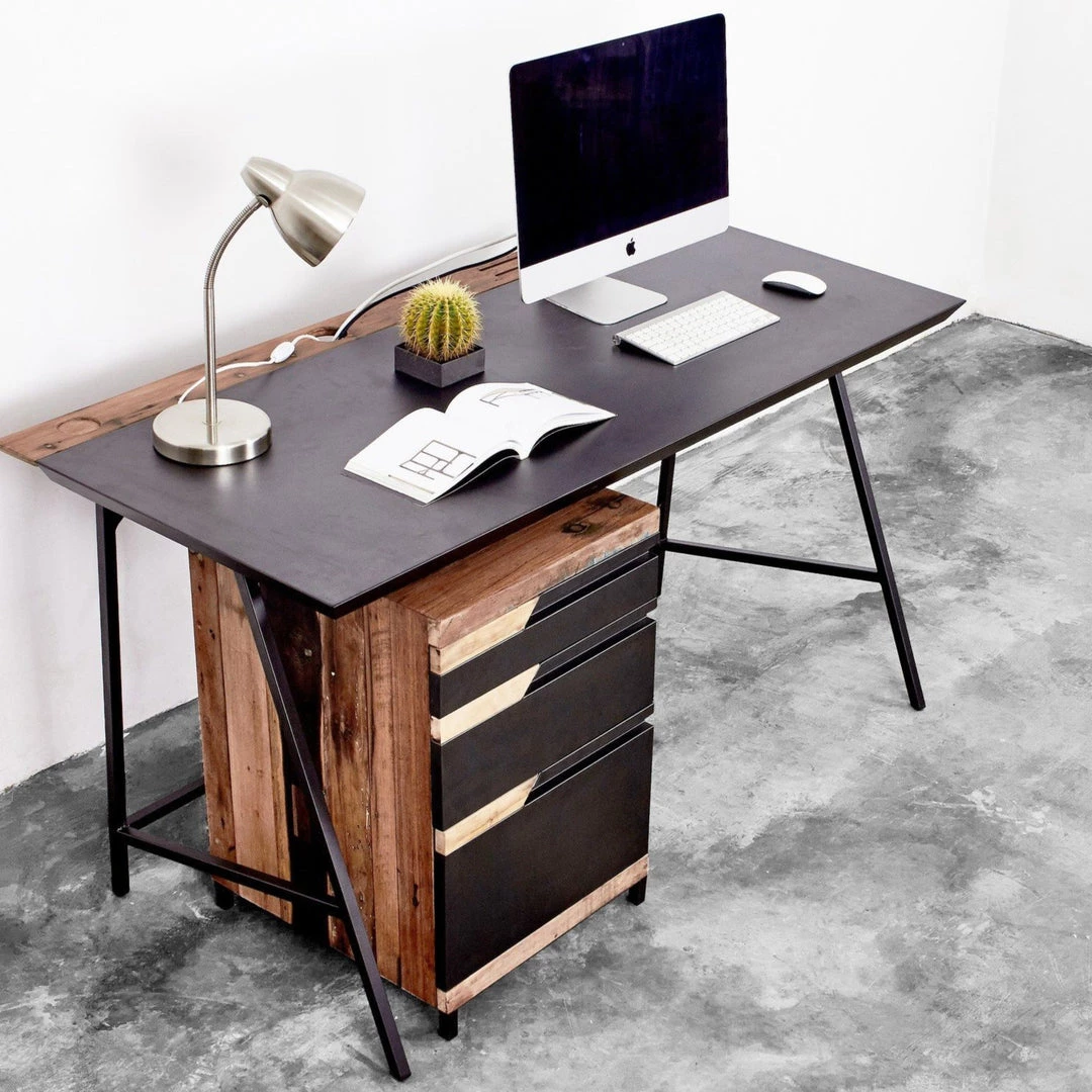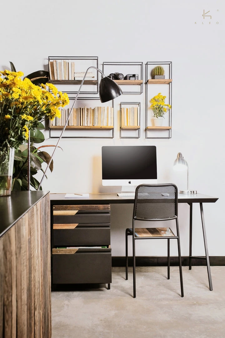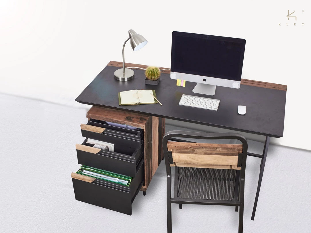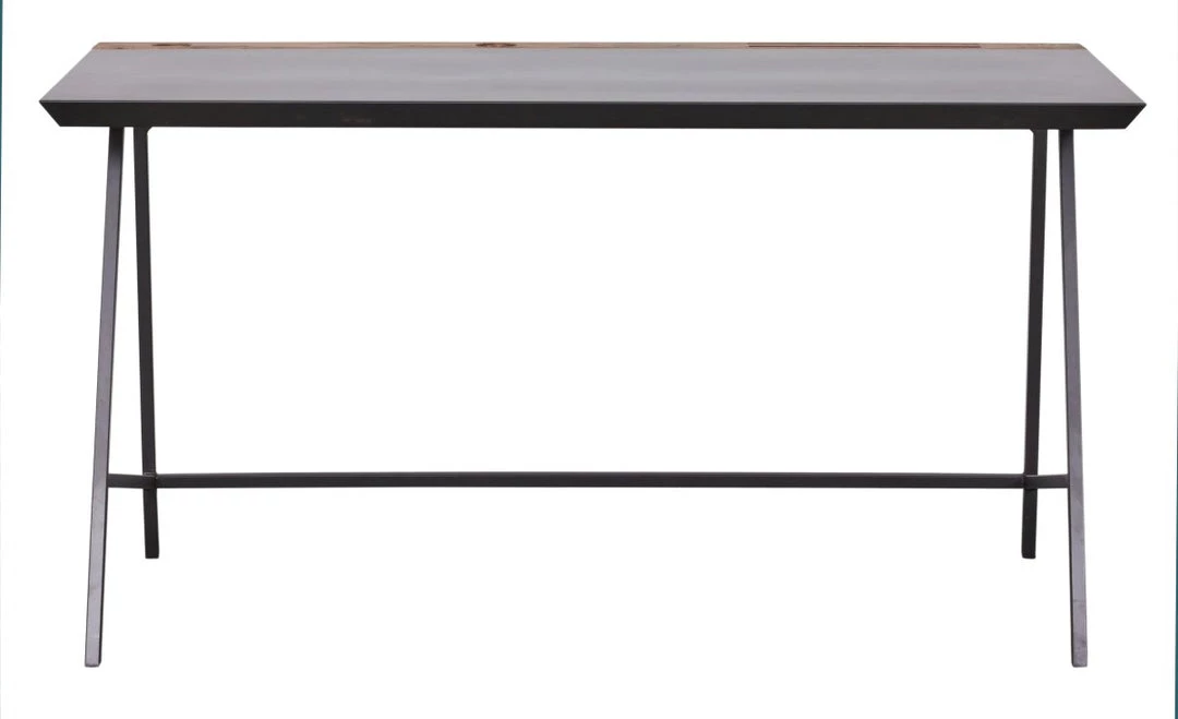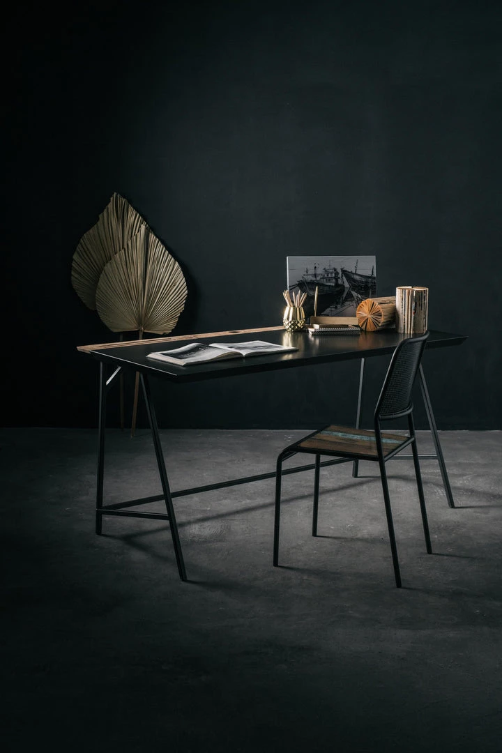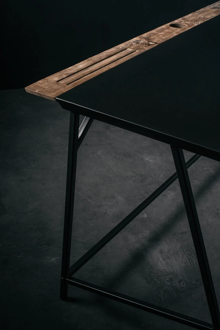 The Fokus work desk comprises of a slimline sleek powder-coated metal frame in a mottled black grey metallic finish in a low sheen. The timber trim is a blend of mixed hardwoods sourced from old fishing vessels which provides a stylish and unique detail to the desktop.