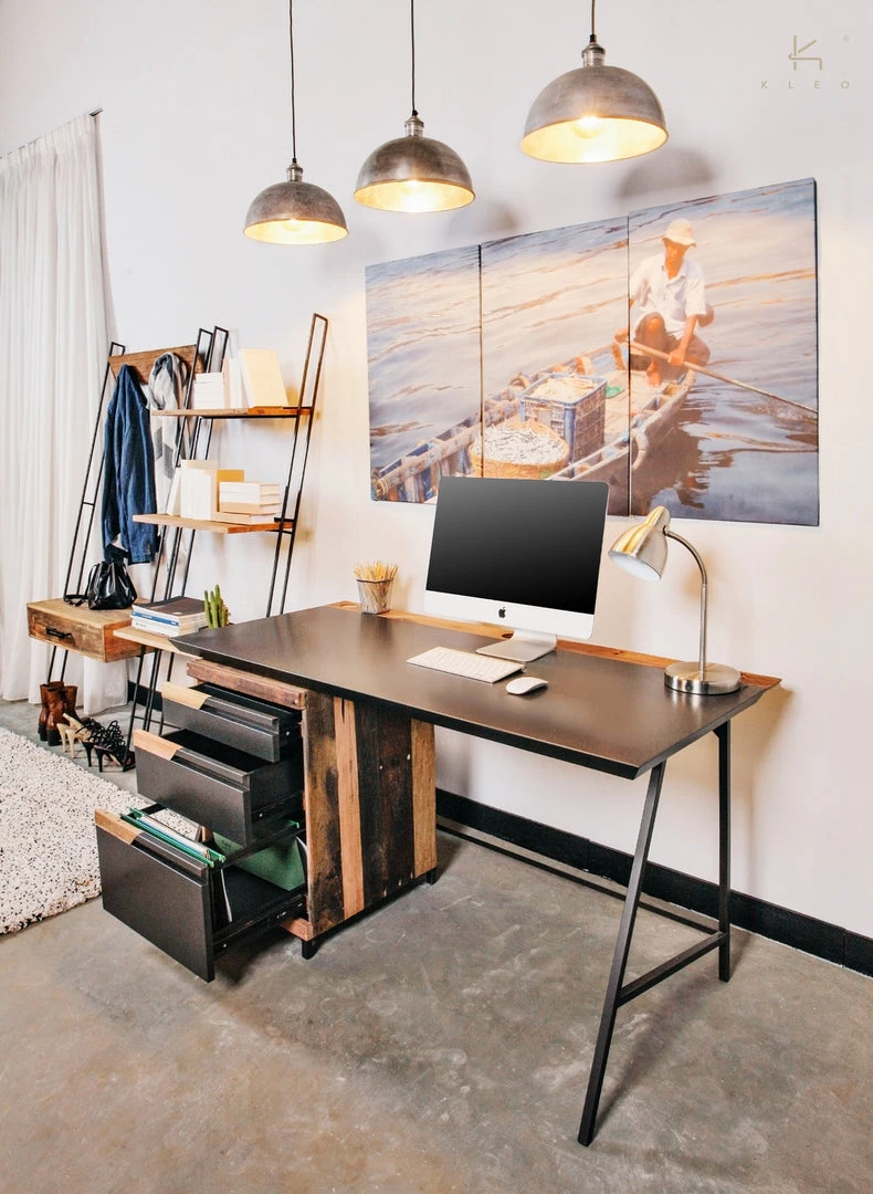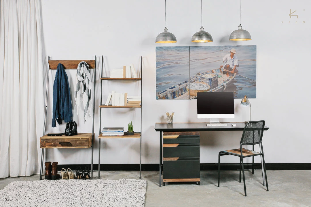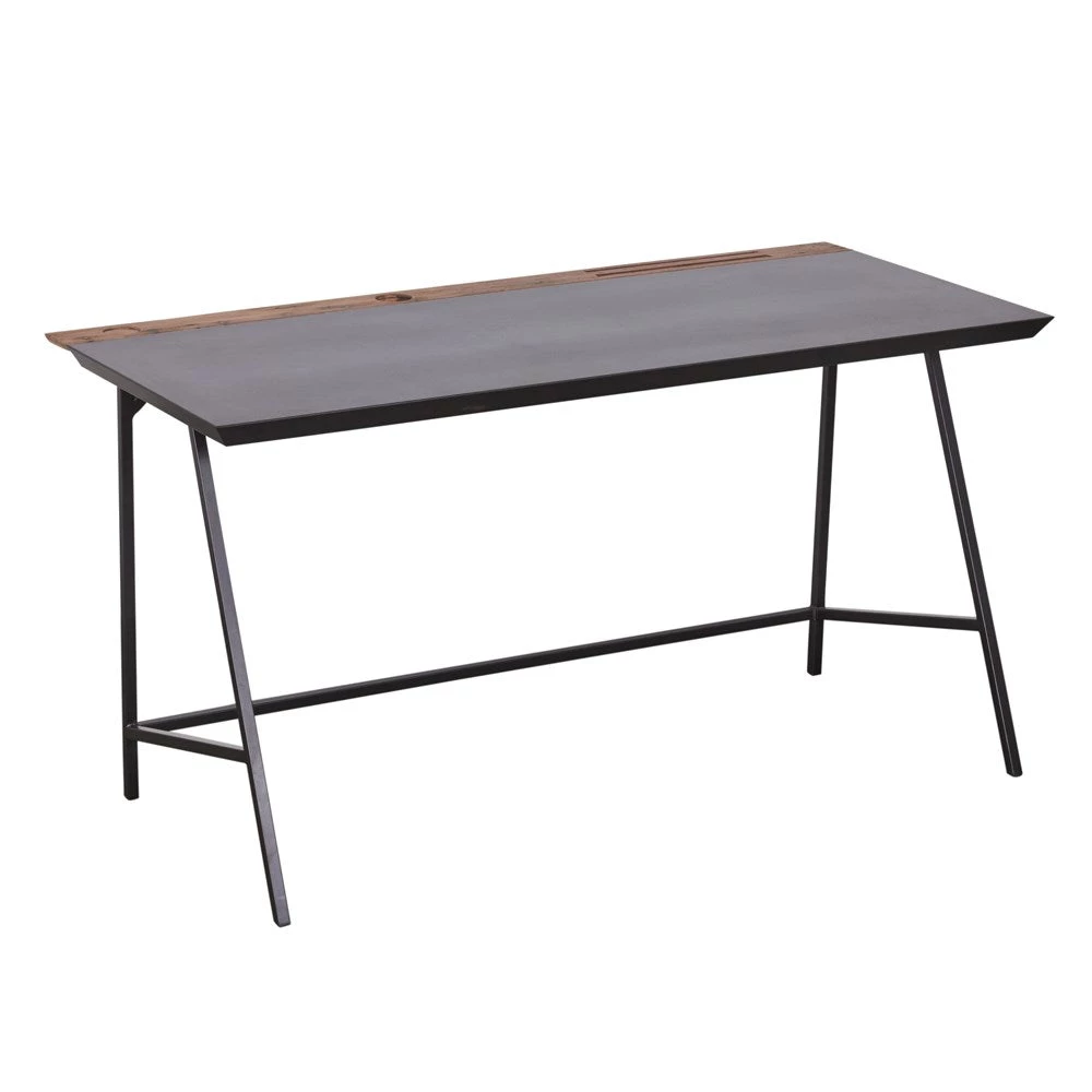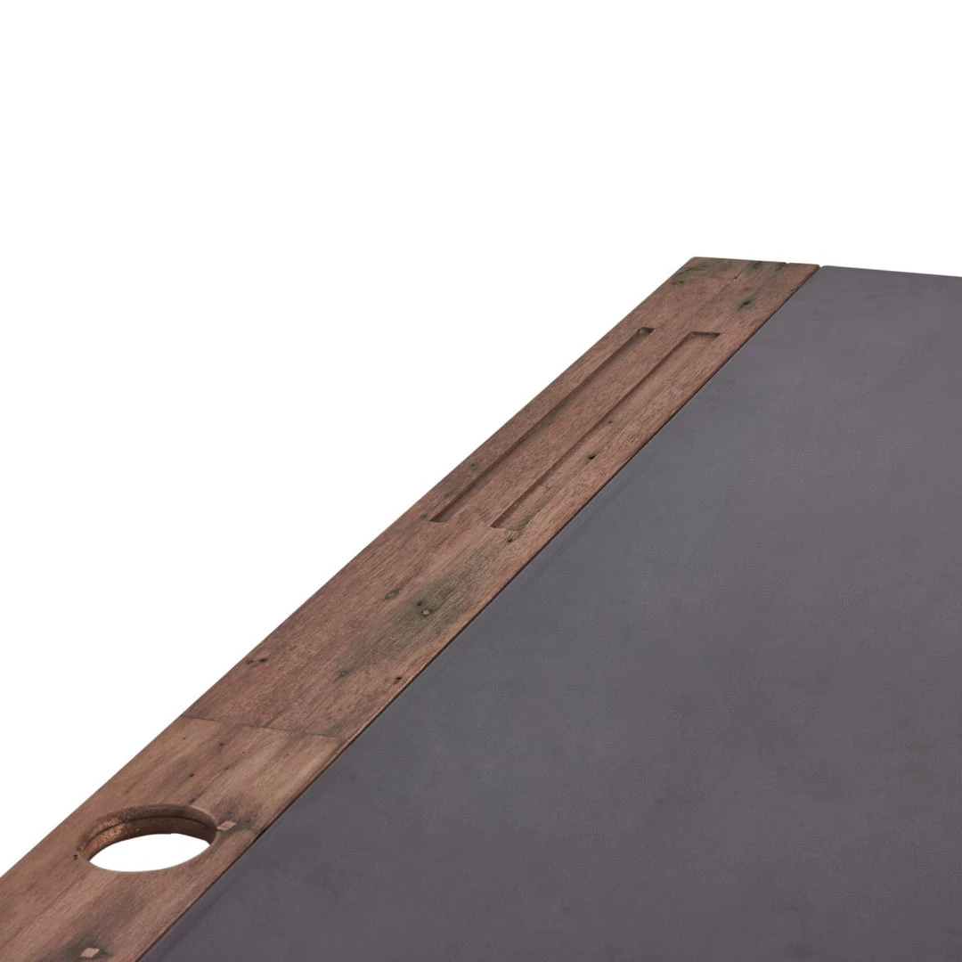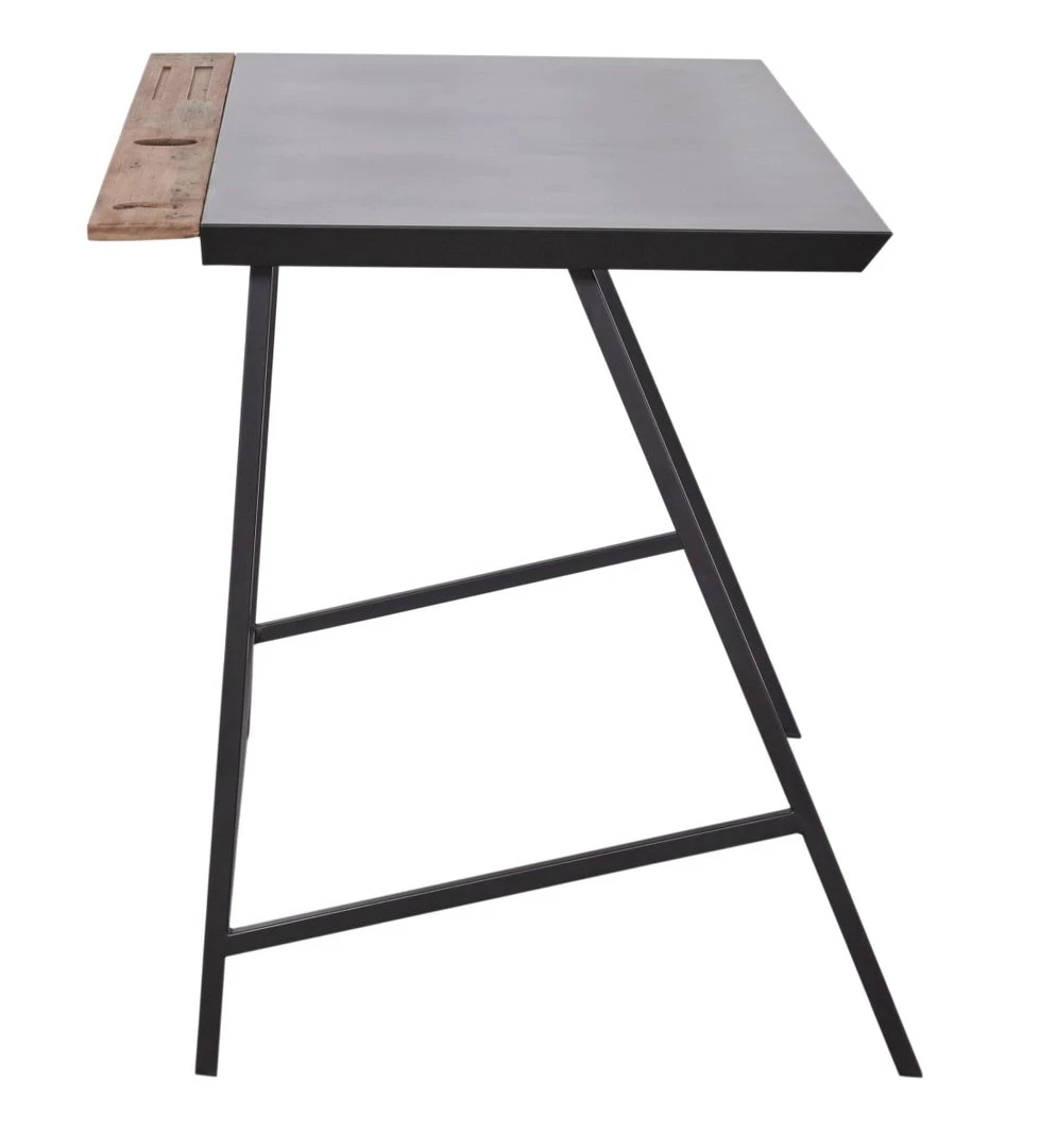 The Fokus work desk comprises of a slimline sleek powder-coated metal frame in a mottled black grey metallic finish in a low sheen. The timber trim is a blend of mixed hardwoods sourced from old fishing vessels which provides a stylish and unique detail to the desktop.