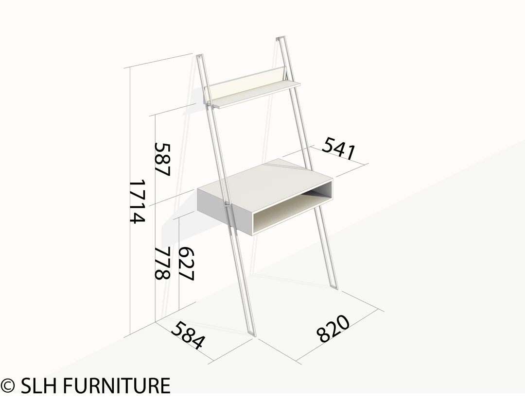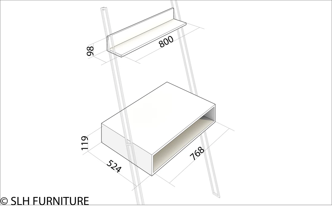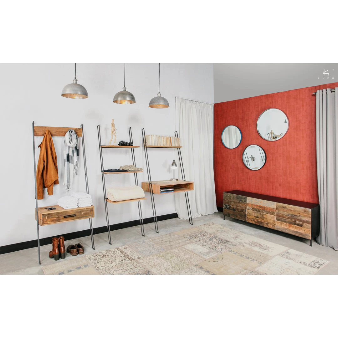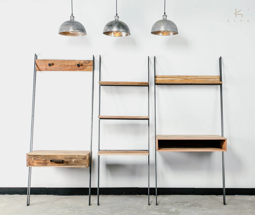 The Nako leaning wall desk with open box storage and book storage is made from powder-coated iron mixed hardwood timber sourced from decommissioned fishing vessels from the north coast of Java, Indonesia. Designed to maximise usage as a functioning work desk, without taking up too much floor space ratio, the Nako Wall Desk can be utilised just about anywhere.