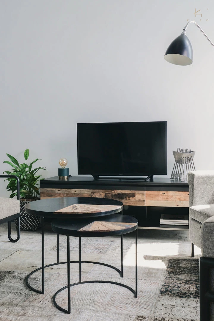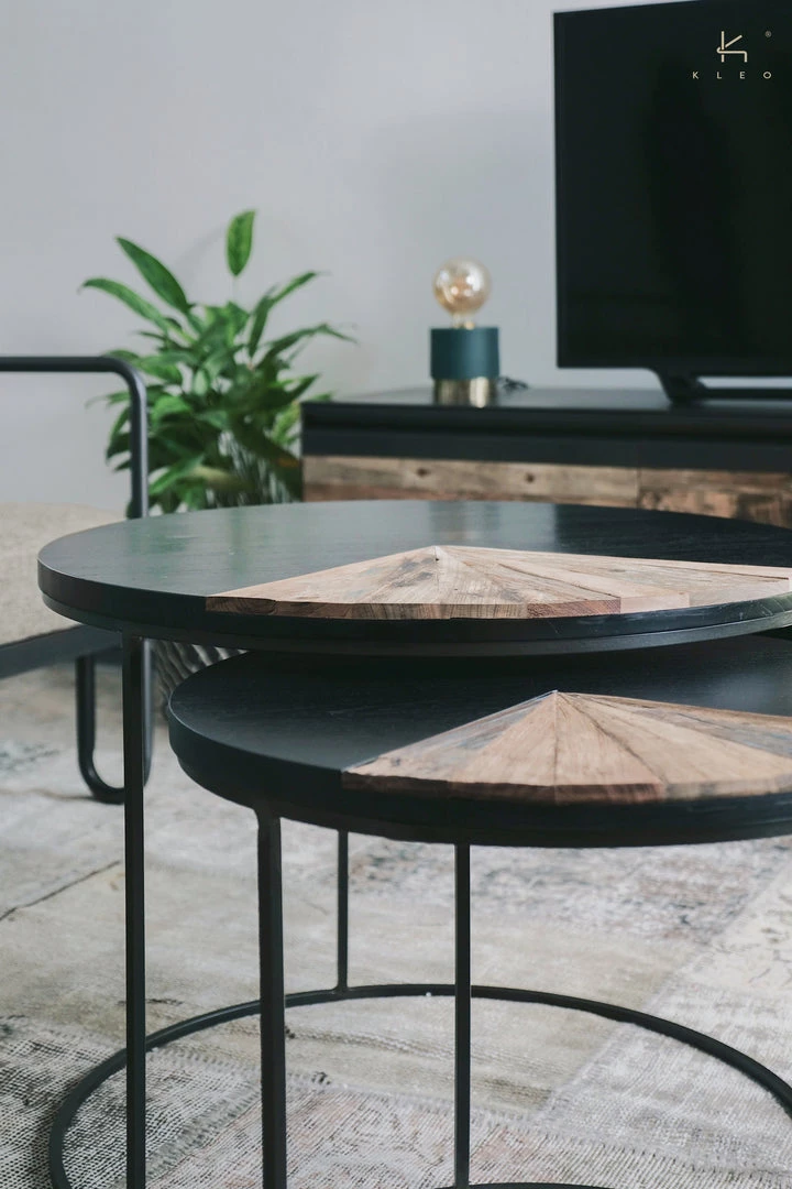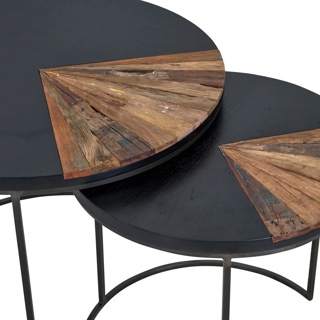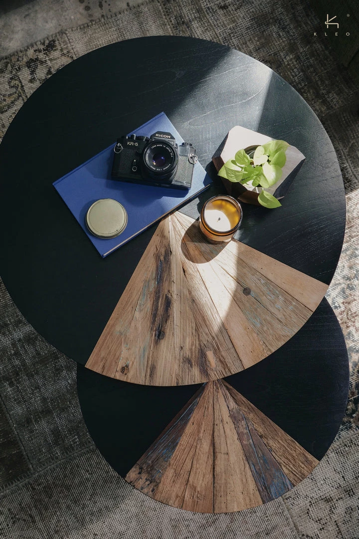 The Sublime Coffee Table set consists of two full moon table heights in a geometric fan pattern. The smaller table can tuck under the larger unit, or be placed separately.