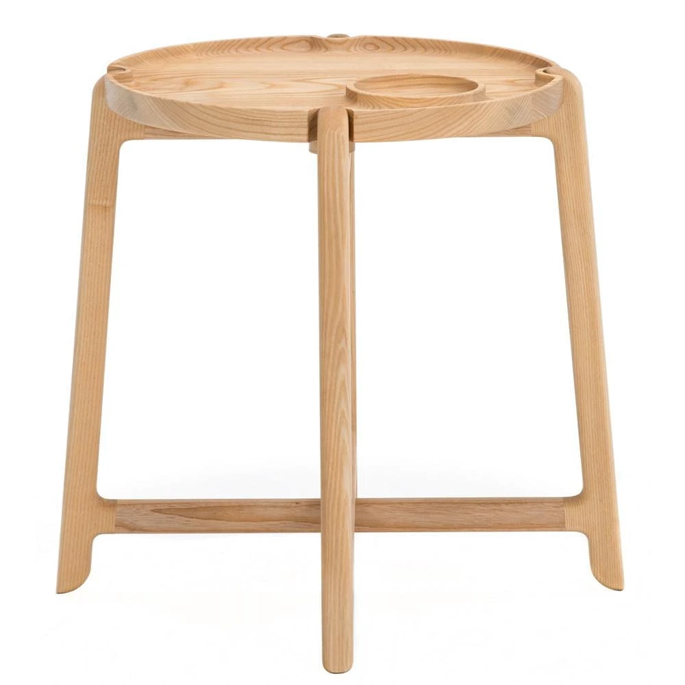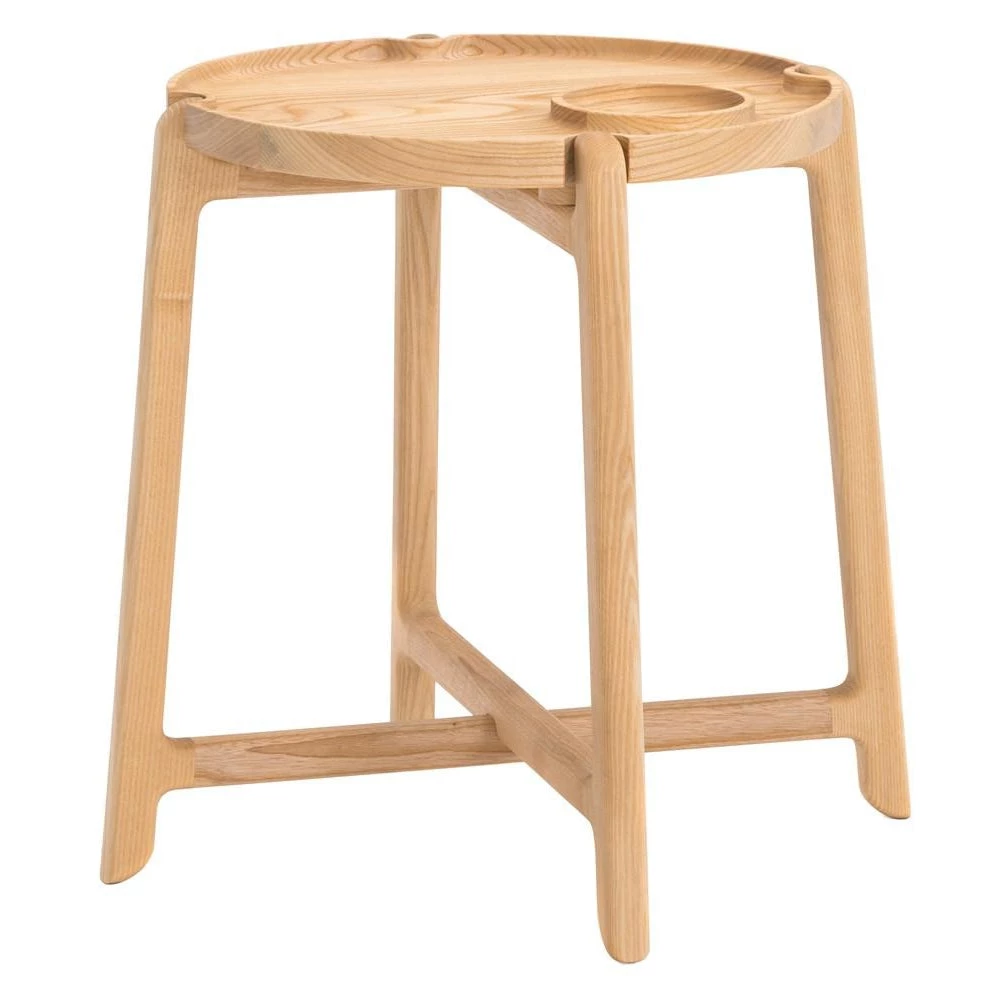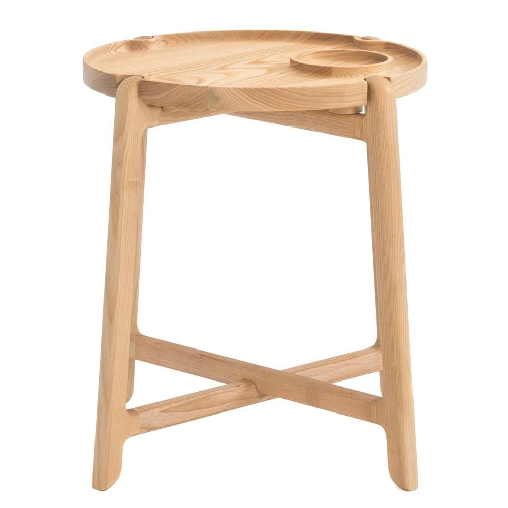 The table is coated with layers of PU varnish to make cleaning easy and keep it nice. The round tray table comes with rounded details on the table legs. The frame on the table is made in an elegant cross that keeps the table stable. The magnets under the tabletop make it easy to take on and off.