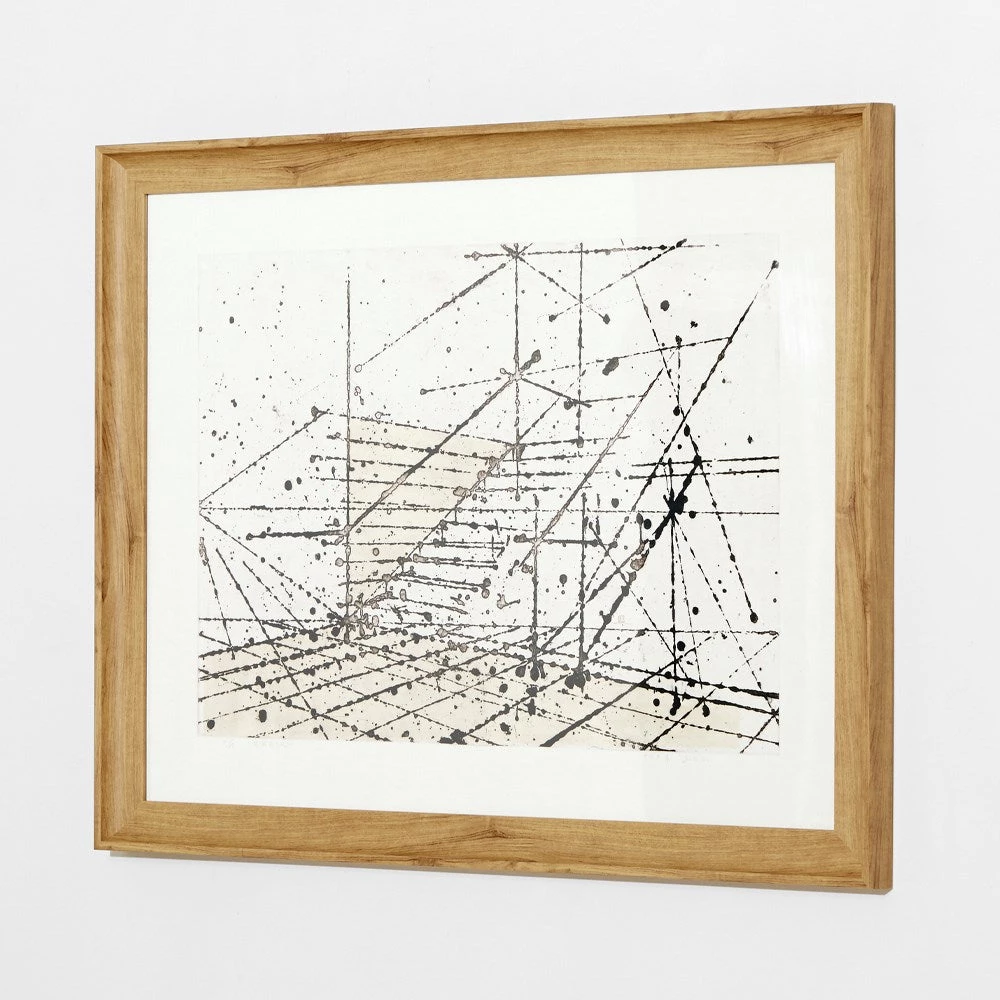 TIME IN SPACE Our Geometric Art range adds depth and architectural inspiration to your interior space. This is a range of five designs themed like Autocad drawings to provide an engaging concept to your wall space. The artwork is set around an oak coloured timber corniced frame and set with a glass frame •Please note that the product image is representational only- colours may appear different on your computer screen. Fragile freight for this range is required.