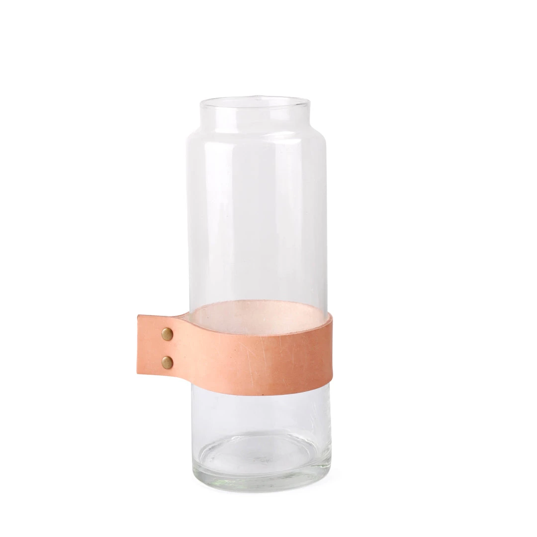 Elementer Clear Glass Skinny Vase with brown leather strap. the Elementer collection utilises naturally beautiful elements: wood, marble, leather and glass; to create high functioning pieces that can be displayed and used around the home.