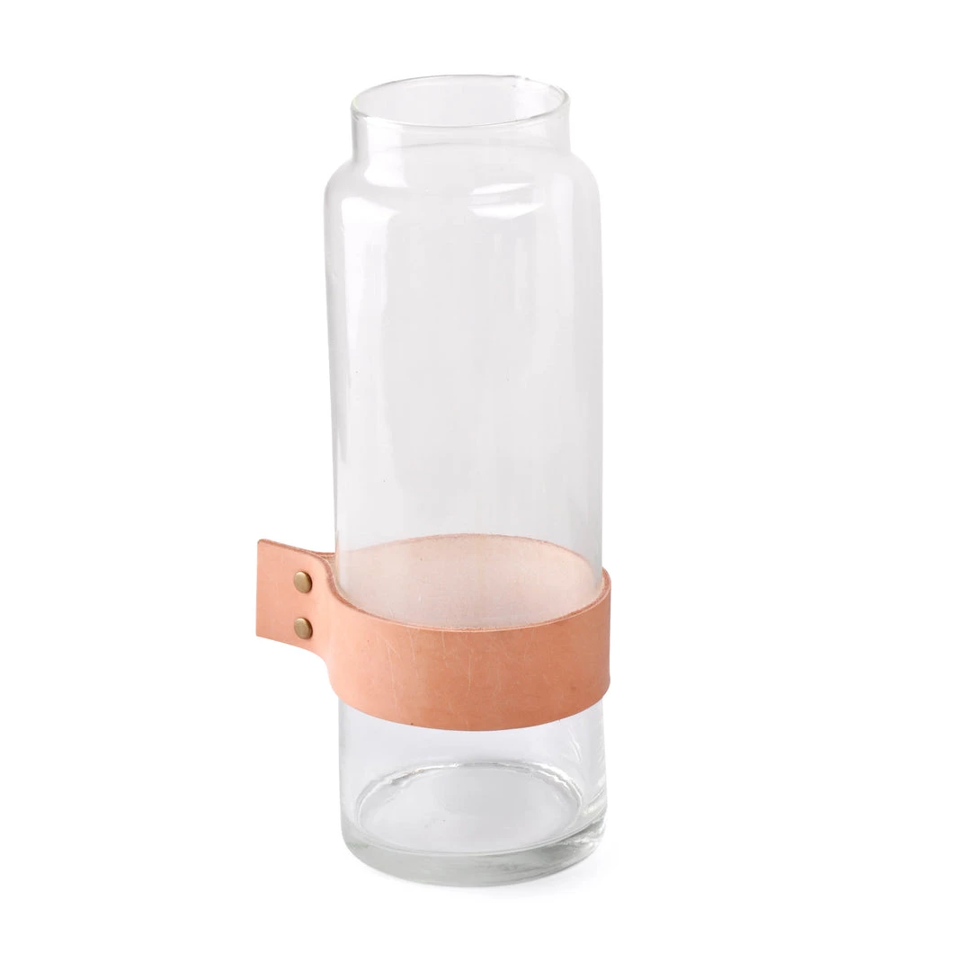 Elementer Tall Clear Glass Vase with brown leather strap. the Elementer collection utilises naturally beautiful elements: wood, marble, leather and glass; to create high functioning pieces that can be displayed and used around the home.
