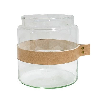 Elementer Clear Glass Vase with brown leather strap. the Elementer collection utilises naturally beautiful elements: wood, marble, leather and glass; to create high functioning pieces that can be displayed and used around the home.