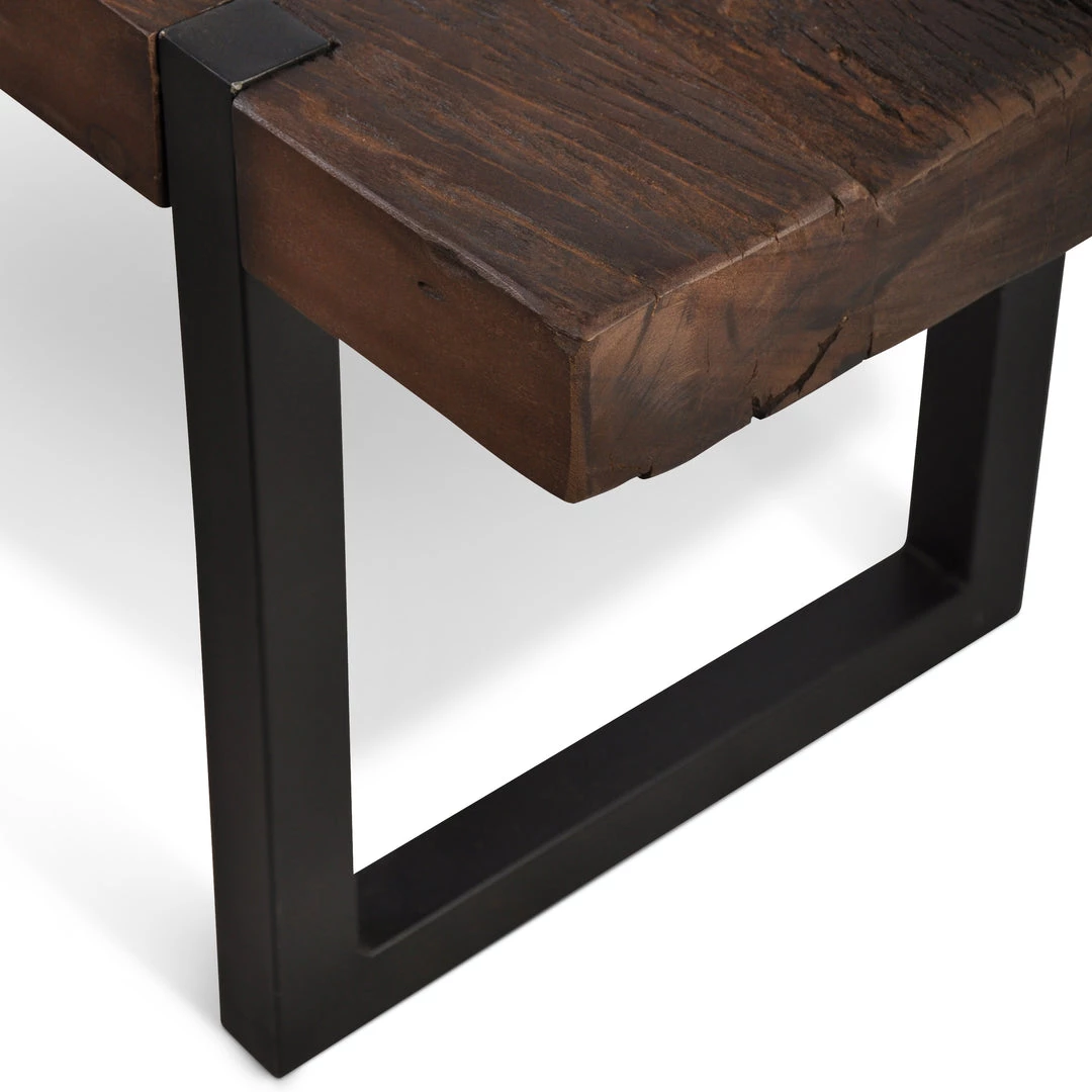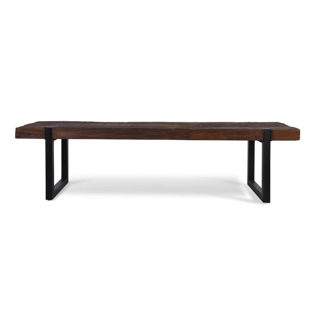 The Railroad Dining Bench is sourced from old railway sleepers with SVLK legal certified sustainably sourced wood, and is coated with a nitrocellulose lacquer. The teak is in a rustic distressed finish, but sanded to take out any fragments or splinters. The metal is coated iron in a black matte finish. The thick slab components portray the solid rustic function of this timbers previous use, and will function in its new role for years to come. This bench is flat packed and requires assembly of the legs.