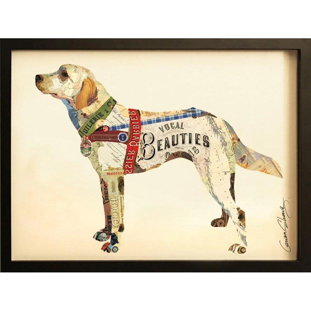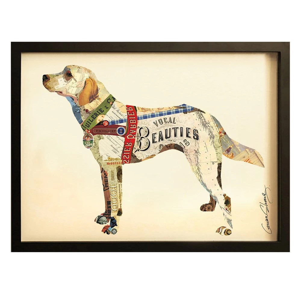 LABRADOR COLLAGE ART. Ever the loyal companion, the Labrador hand made collage art is presented on cream art paper in a Black shadow box frame with glass cover.