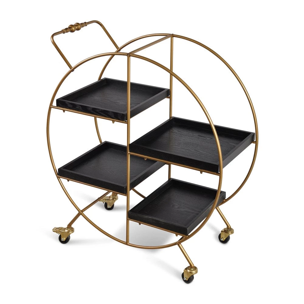 Drinks anyone? You can serve your drinks in style with the Luxe drink trolley. Impress your friends and family when they come round. The Luxe Drinks Cart features four wood shelves with the handle, frame and spindle wheels in a mottled aged gold colour finish in semi gloss,.
