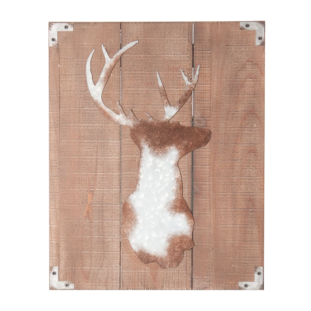 This stag wall decor is crafted on timber panels with an antique metal finish.