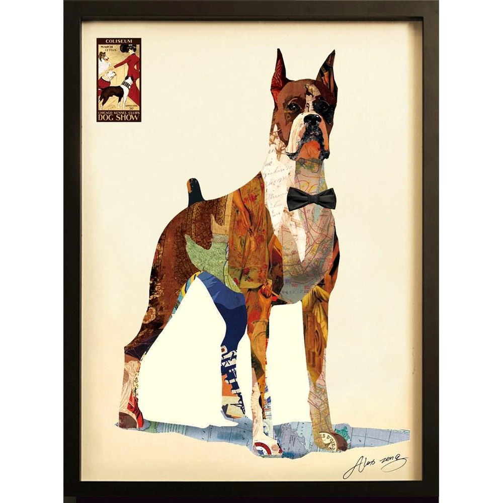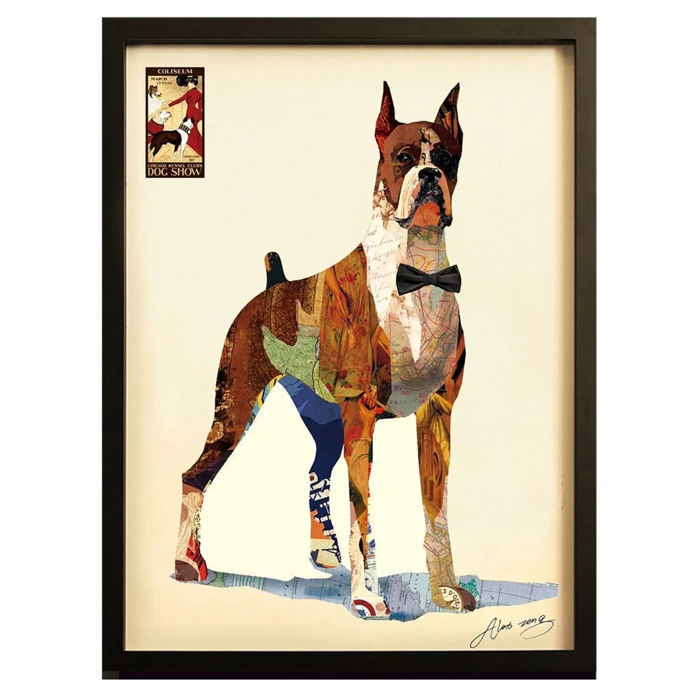 COLLAGE ART SMART BOXER. Dressed for success,and looking regal to boot. Now in black frame with glass cover, he is ready to find his new home. Each artwork is presented on cream art paper in a black box frame with glass cover.